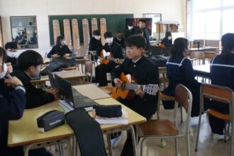 公開授業①(2月14日) 学校経営アドバイザー訪問がありました。授業通覧があり、各学級をまわりました。カントリーロードの弾き語りにチャレンジしよう(音楽)、未成年にとっての飲酒の害を理解しよう(保健体育)という授業です。