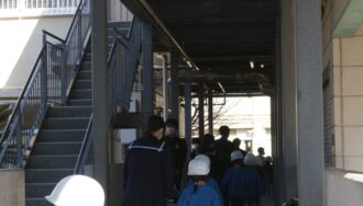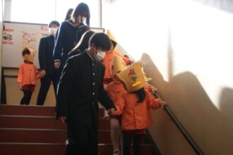 避難訓練(12月15日) 城東地区の保幼中連携を目的とし、地震・津波を想定した合同避難訓練でした。城東中学校2年生が江陽保育園と丑之助学園の園児と手をつなぎ校舎の4階まで避難訓練を行いました。中学生は、園児の歩くペースに配慮しながら階段を上がっていました。