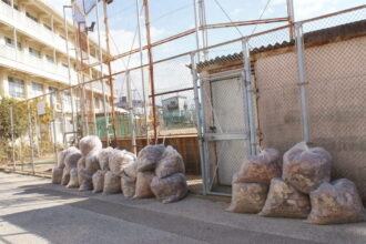 城東中の応援団として、城東33グループの皆様に2026年もご協力をしていただいています。どうぞよろしくお願いします。東門から自転車置き場までの木々の枯葉を掃除していただきました。枯葉などゴミ袋に24袋集まりました。城東33グループの皆様、お忙しい中、有難うございました。