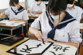 3年生が修学旅行で不在ですが、1・2年生の教室では、落ち着いた状態で授業が行われています。2年英語では、パフォーマンステストが行われ、JR先生に自分の夢を語っていました。1年国語では毛筆の授業が行われていて、「天地」とい…